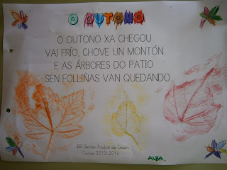 Estes días estamos rematando co outono e dando xa as primeiras pinceladas do Nadal, do que non fan mais que falar. Hoxe investigamos sobre distintas follas que hai polo patio, sobre todo unhas vermellas que lle chaman moito a atención e despois deixamolas plasmadas en papel.